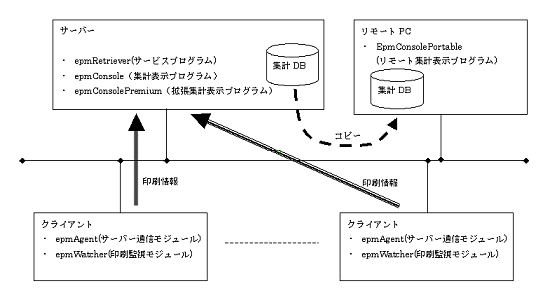 | はじめに 本システムはEco Print Managementの集計表示プログラム(epmConsole、epmConsolePremium)がサーバー上で稼動するのに対して、リモートのPC上で集計、表示、印刷を行えるものです。従って、サーバーと離れた場所からも印刷状況を把握することが出来ます。 また、本システムはepmのデータベースをEco Print Management Console Portableが稼動するPCにコピーして集計を行うためオフラインでも使用でき、ノートPC等にインストールすることにより、会議等に持ち込んで集計情報を閲覧することができます。  必要システム及び動作環境